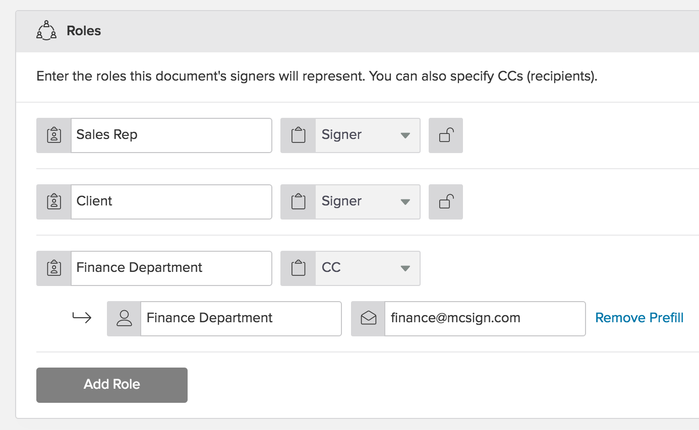 Pre-fill Roles: As you can see in the image below, roles can also be pre-filled. In this particular use case, a Sales Offer template is created with two signer roles: Sales Rep and Client. In addition to these, a CC role is defined and pre-filled using the Financial Department's details. Whenever this template is used, the company's Finance team will receive a copy of the Sales Offer being sent. The Client and Sales Rep roles, on the other hand, are variable.