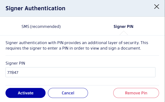 As an additional safeguard ensuring the authenticity of your signers, you can assign each signer a PIN, which they are required to enter before being able to start signing your document.