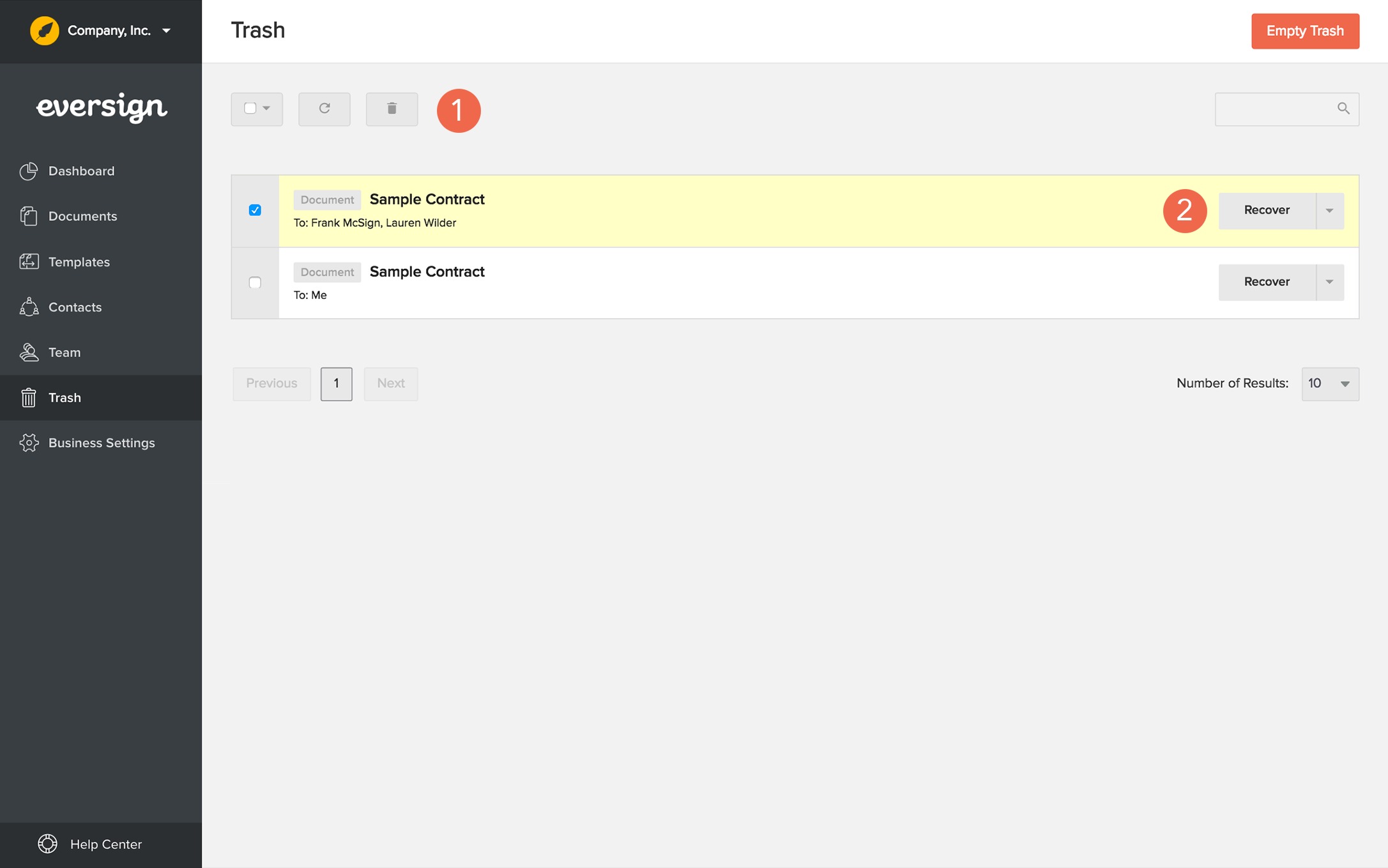 Your Trash contains deleted documents and templates. These items can be deleted permanently or recovered using the bulk action buttons the top left (1) and the righthand button menu next to each trashed item (2).