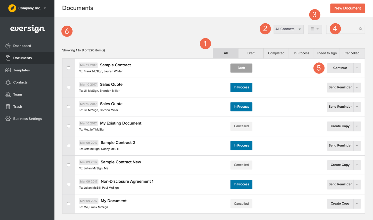 - Documents Summary: At the top left of your Dashboard you will find a summary listing the number of documents per status. This summary includes documents awaiting your signature, in process, and completed documents.