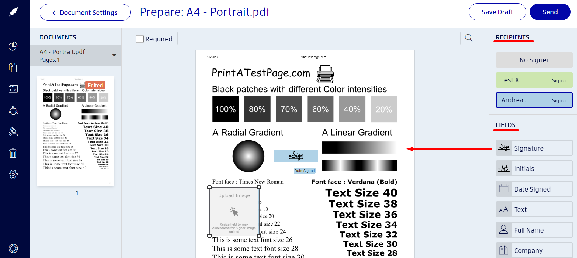- Center: Workspace At the center you will see your document pages listed in an easily readable size. This is where most of your preparation work will take place and where fields will be placed.