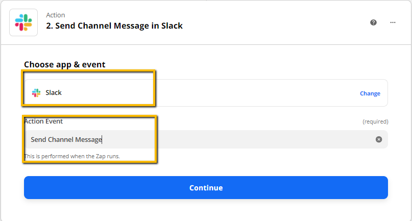 5. Choose the action app and the action event that will be triggered, in our case Slack and "Send channel message", and then sign in to your Slack account through Zapier: