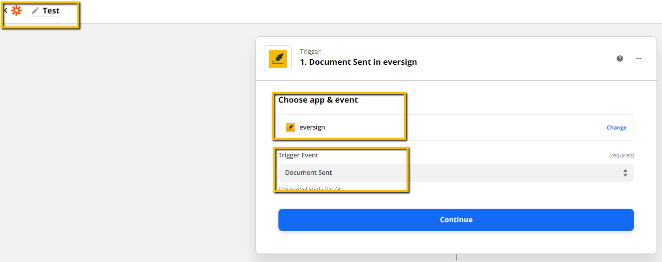3. You can name your Zap in the top left corner and search for Xodo Sign under apps and choose Document Sent as trigger event