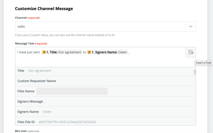 6. Choose the Channel where you want to post the automated message and the Message Text and choose from a range of placeholders like "file name", "title", "signer's name" or "signer's ID" to insert in the message. You can also add a plan text to the message, like in the example below: