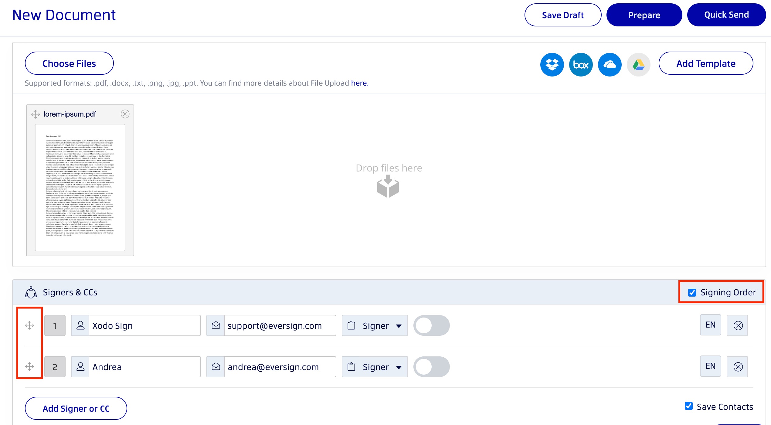 When working with multiple signers there will be a "Signing Order" checkbox at the top right of the contacts section. If enabled, you can adjust the signing order of your document's signers by dragging them up or down using the handle on the left side of each signer row: