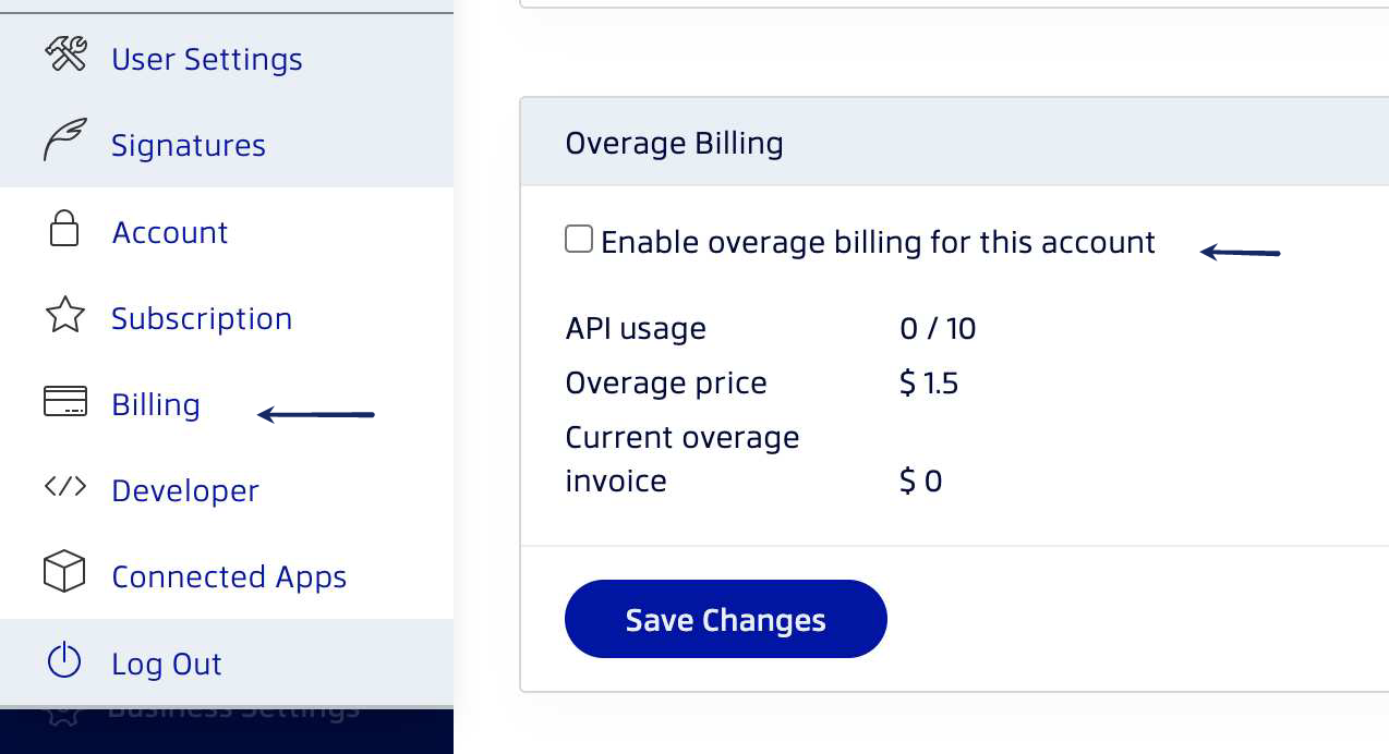 We are working on updating this functionality, and at the moment it is not possible to turn on Overage Billing in your settings. If you want to have Overage Billing enabled for your account, you can contact our Support (help.eversign.com) or Sales (sales@eversign.com) teams.