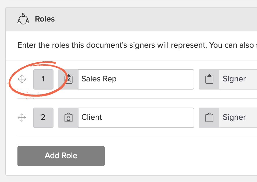When working with multiple signer roles there will be a "Signing Order" checkbox at the top right of the contacts section. If enabled, you can adjust the signing order of your template's signers by dragging them up or down using the handle on the left side of each signer row.