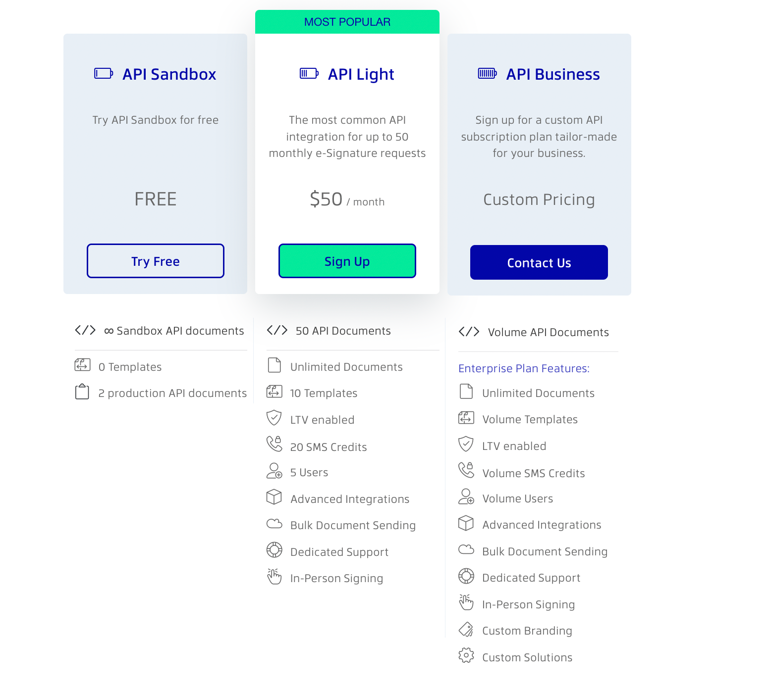 The API subscription plans start at $50 for an API Light plan, which includes 50 monthly API requests. Other than that, a number of other features are included as well, such as 10 templates, 20 SMS credits, and 5 user seats. Additionally, if your estimated usage exceeds the API Light plan, our Sales team can set up a custom API Business solution for you.