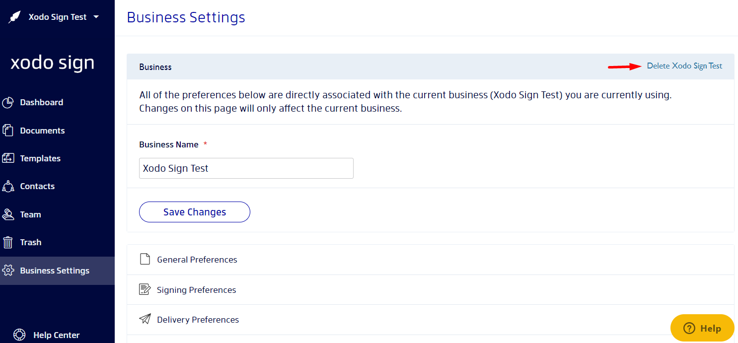Please note that the "Cancel Account" button available on the Account page will delete your entire Xodo Sign account, including all businesses. Please do not confuse this option with the Delete Business option described above